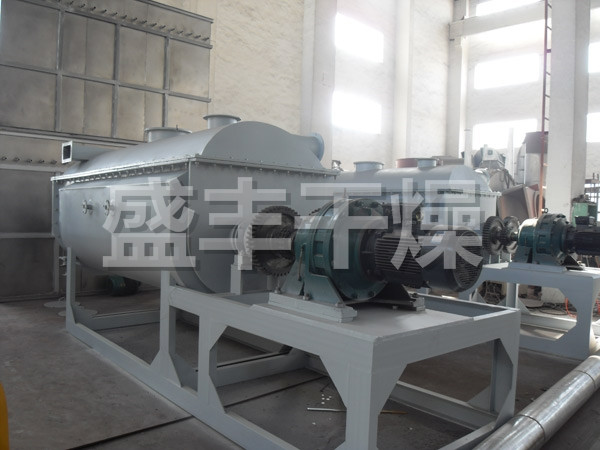 空心軸上密集排列著楔型中空漿葉,熱介質(zhì)經(jīng)空心軸流經(jīng)漿葉。單位有效容積內(nèi)傳熱面積很大,熱介質(zhì)溫度從-40℃到320℃,可以是水蒸汽,也可以是液體型:如熱水、導(dǎo)熱油等。間接傳導(dǎo)加熱,沒(méi)有攜帶空氣帶走熱量,熱量均用來(lái)加熱物料。熱量損失僅為通過(guò)器體保溫層向環(huán)境的散熱。楔型漿葉傳熱面具有自清潔功能。物料顆粒與楔型面的相對(duì)運(yùn)動(dòng)產(chǎn)生洗刷作用,能夠洗刷掉楔型面上附著物料,使運(yùn)轉(zhuǎn)中一直保持著清潔的傳熱面。漿葉干燥機(jī)的殼體為Ω型,殼體內(nèi)一般安排二到四根空心攪拌軸。殼體有密封端蓋與上蓋,防止物料粉塵外泄而充分發(fā)揮作用。