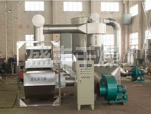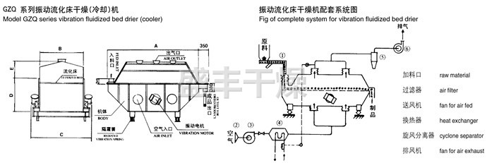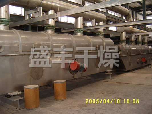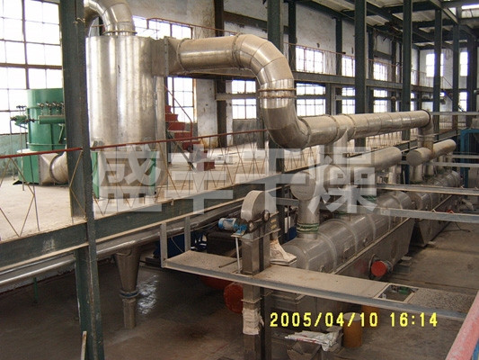 物料自進料進口進入機內,在振動力作用下,物料沿水平面流化床拋擲,向前連續運動,熱風向上穿過流化床同濕物料換熱后,濕空氣經旋風分離器除塵后由排風1:3排出.干燥物料由排料進口排出。