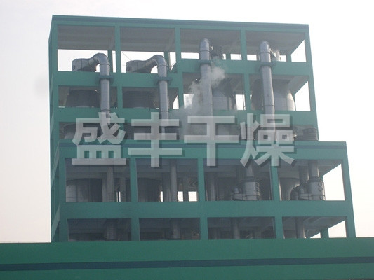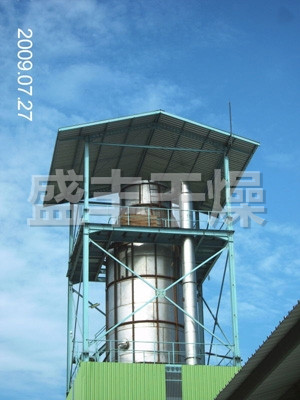 本機組工作過程為料液通過隔膜泵高壓輸入,噴出霧狀液滴,然后同熱空氣并流下降,大部分粉粒由塔底排料口收集,廢氣及其微小粉末經旋風分離器分離,廢氣由抽風機排出,粉末由設在旋風分離器下端的授粉筒收集,風機出口還可裝備二級除塵裝置,回收率在96-98%以上。