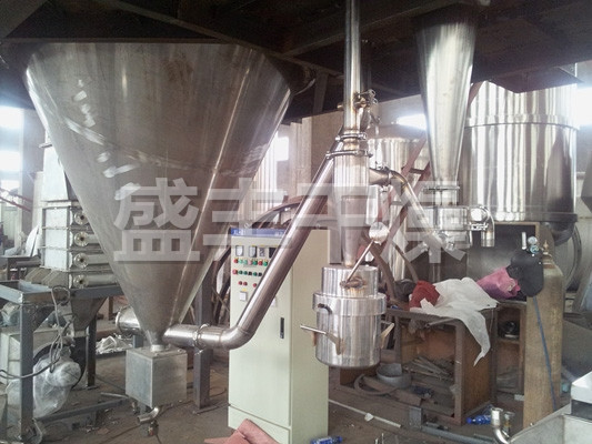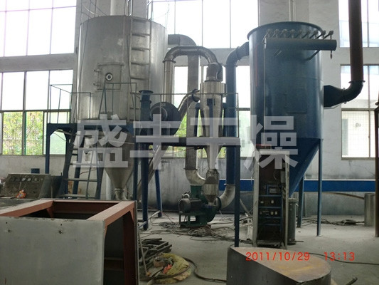 該機采用全封閉形式,所有部件均采用不銹鋼制造,配有三級凈化裝置,過濾后的空氣達十萬級要求。筒體與頂部裝有冷壁裝置,使壁溫<80℃,干燥塔內裝有氣刷掃塔裝置。經該機干燥后的中藥浸膏粉,不會出現焦化變質現象,大大增加了收粉率(95%以上),而且不會產生混藥現象和粘壁現象。