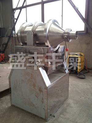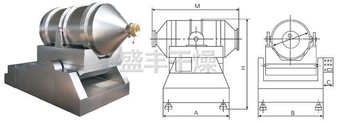 EYH二維混料機的轉筒可同時進行二個運動,一個為轉筒的轉動,另一個為轉筒隨擺動架的擺動。被混合物料在轉筒內隨轉筒轉動、翻轉、混合的同時,又隨轉筒的擺動而發(fā)生左右來回的摻混運動,在這兩個運動的共同作用下,物料在短時間內得到充分的混合。EYH二維混料機適合所有粉、粒狀物料的混合。